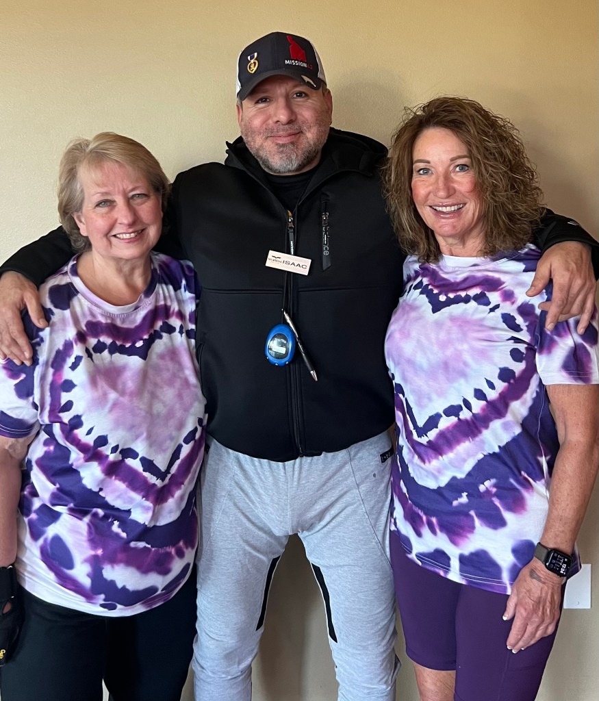 This picture is “Dee” and me with our trainer Isaac. Isaac is a veteran who received a Purple Heart for injuries he incurred in Iraq 20 years ago. We trained with him on the 20-years anniversary of his injury date. “Dee” purchased these Purple Heart shirts for us to wear during our training, to honor Isaac and his sacrifice.